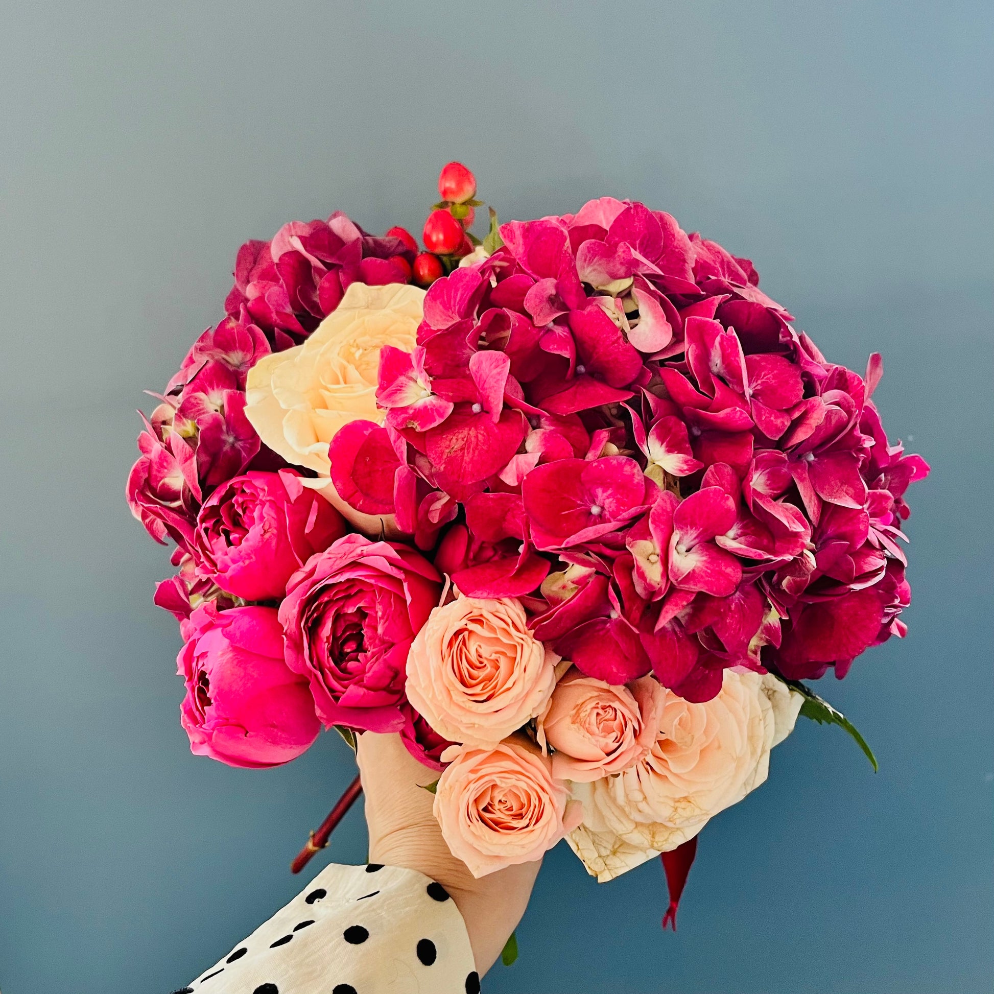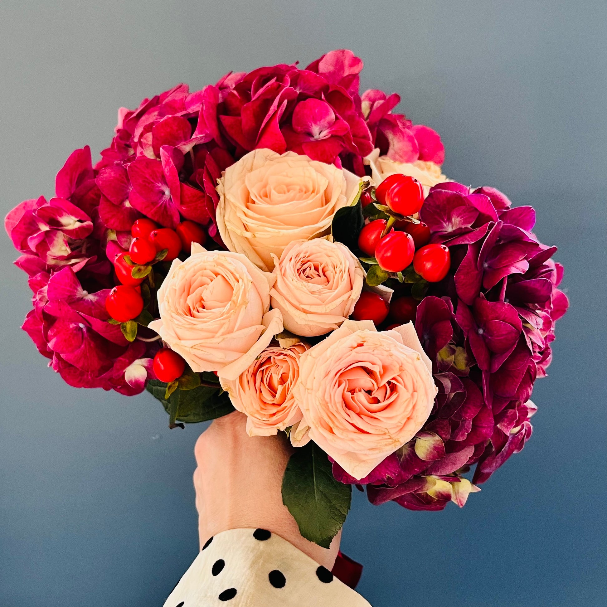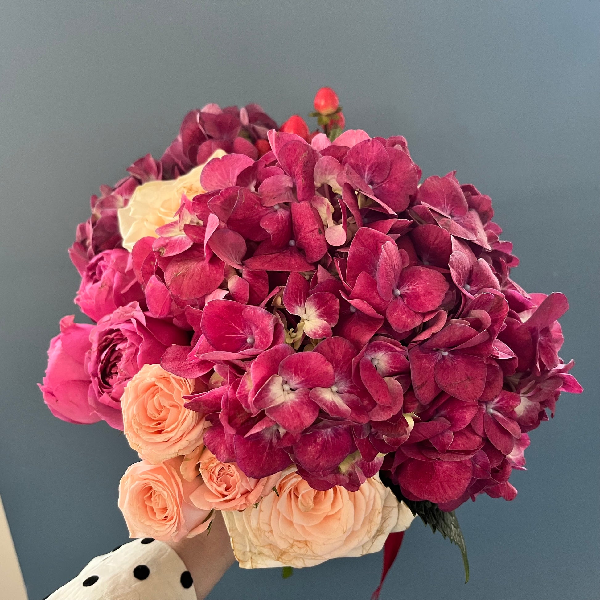 Larger bouquet in our Valentine's collection blend ample hydrangeas, garden and mini roses, accented by a sprinkle of hypericum.